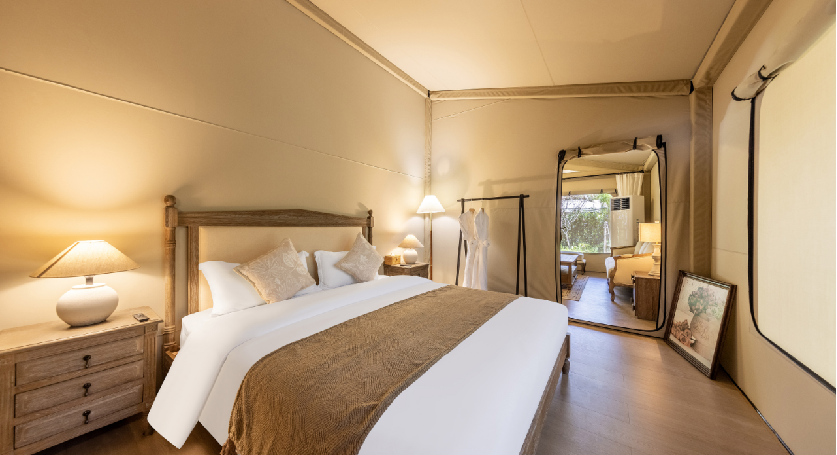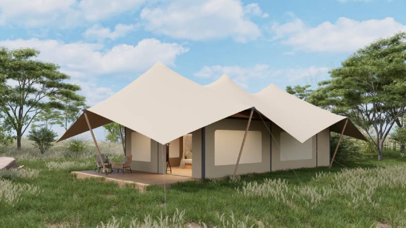 主材:优质碳钢钢管(氟碳漆防锈处理) 外膜:700g弹力布 内帐及墙体:帆布规格:6m*10m 套内面积:62㎡ 投影面积:142.97㎡ 产品面积:60㎡地台面积:94㎡ 抗风等级:6级以下